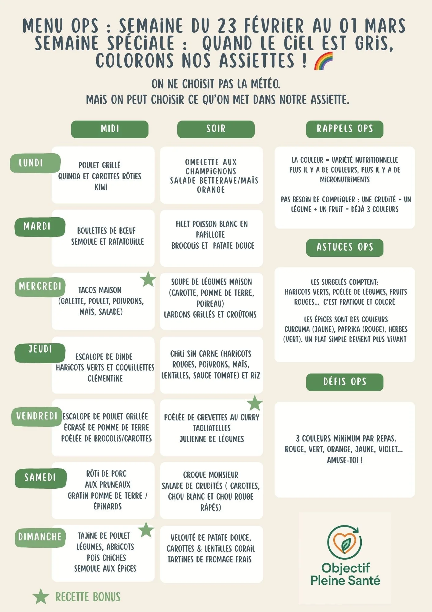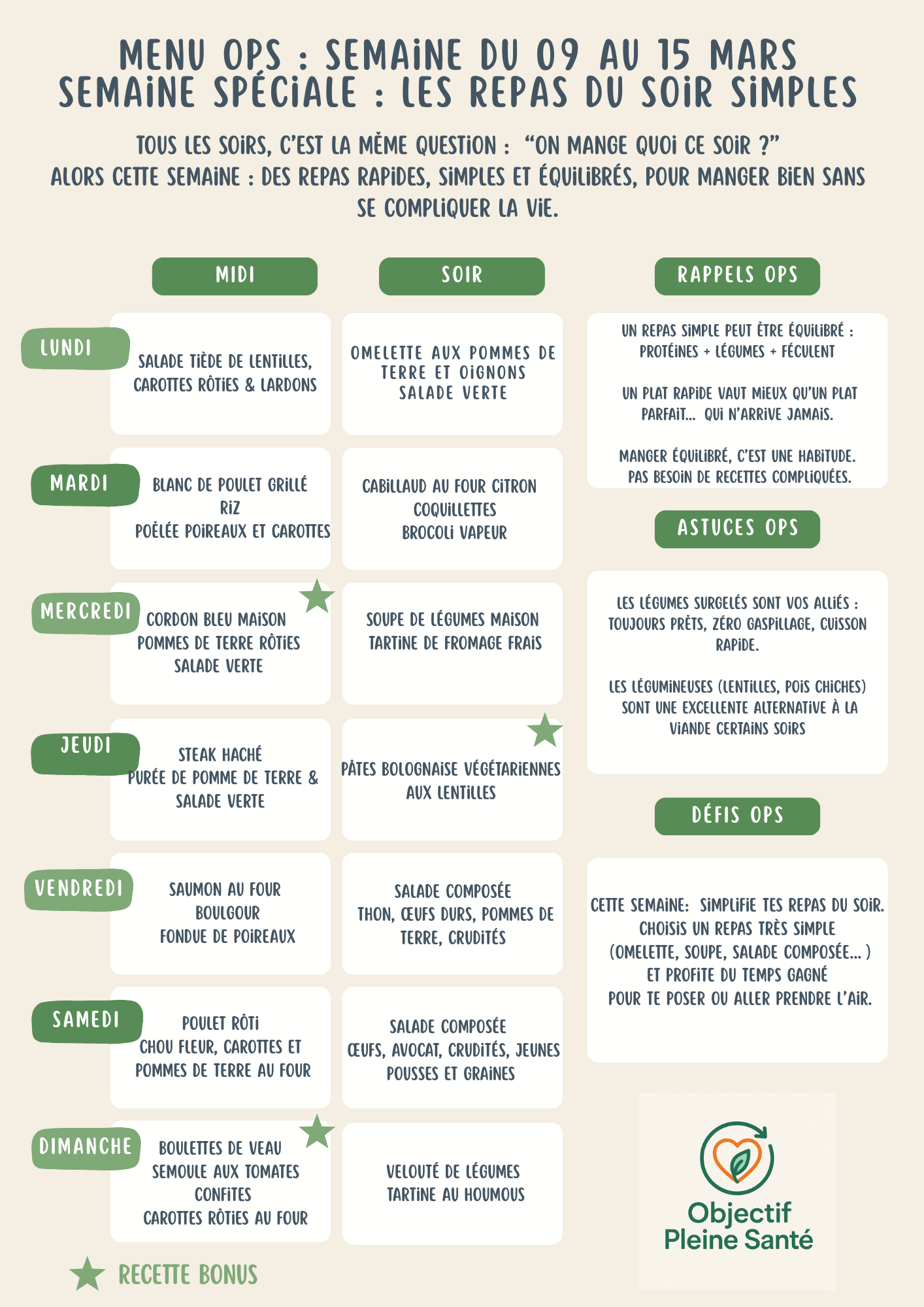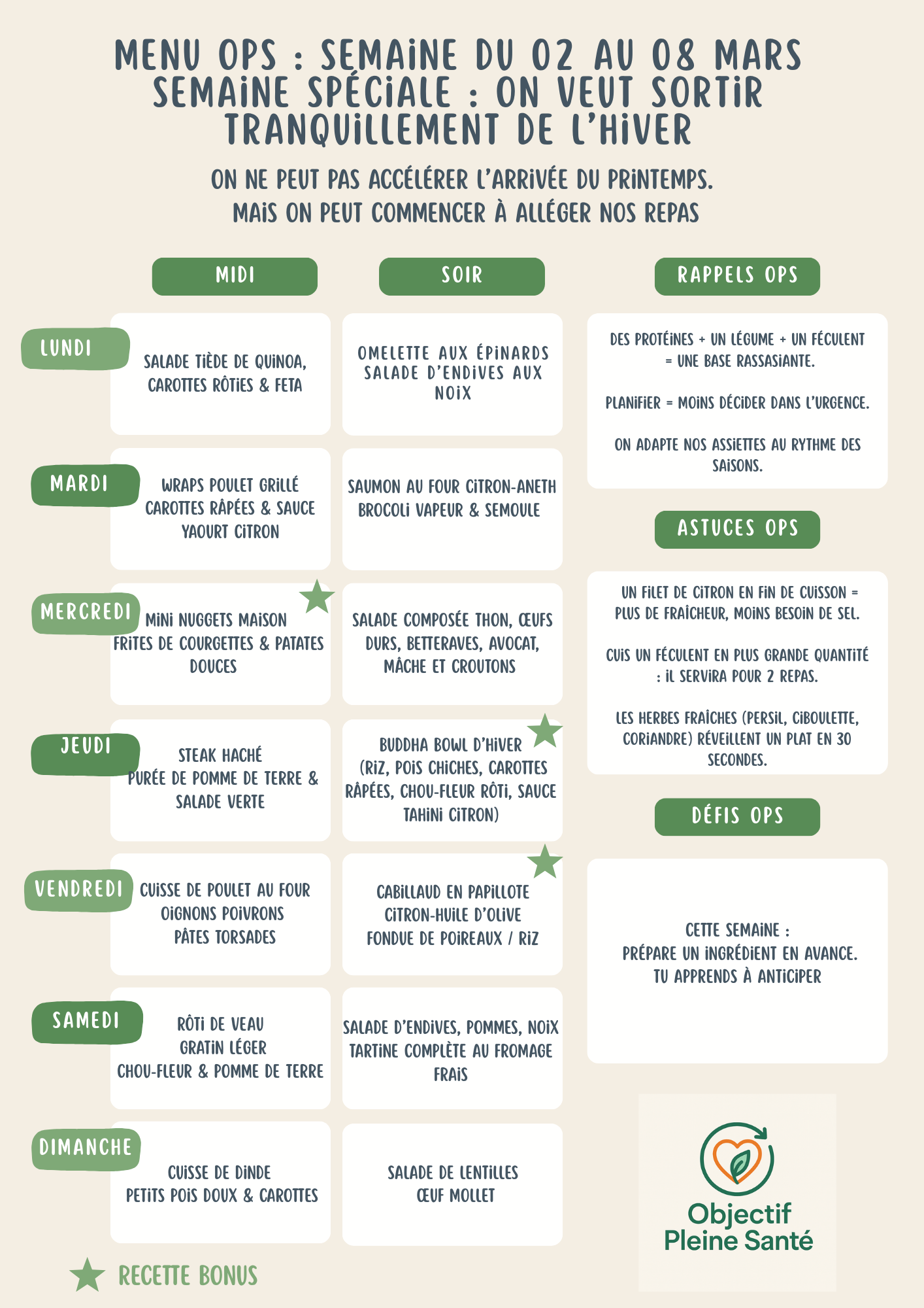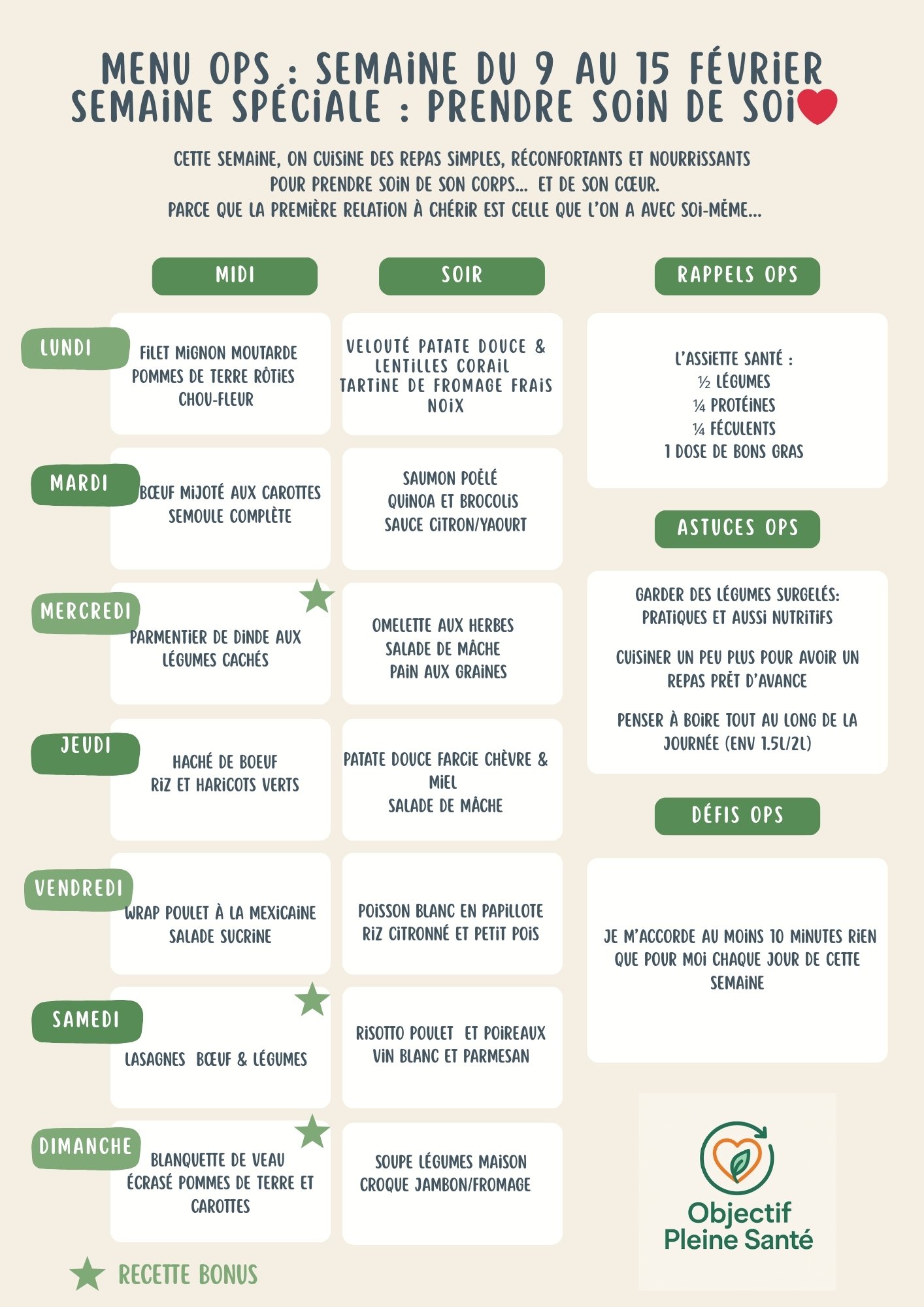Chaque semaine, je te propose un menu simple et équilibré pour t’aider à mieux manger au quotidien, sans te compliquer la vie.